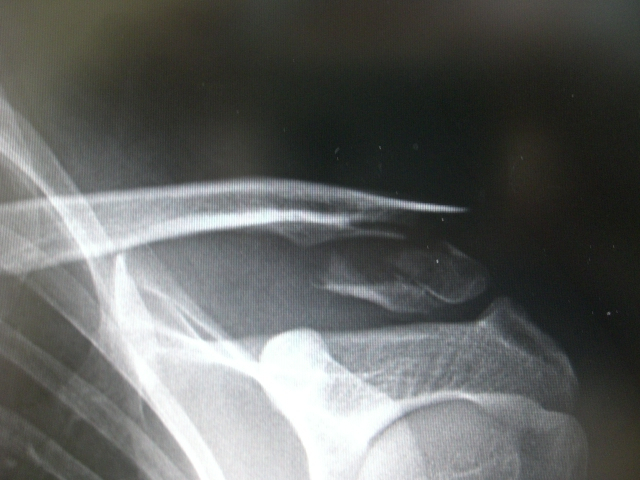かなりいい形で整復されています。鎖骨バンドをきちんと着けていると、肩を動かしている間に自然と整復されていきます。骨折部が動かなくなったことを確認して、弾性包帯を外しました。